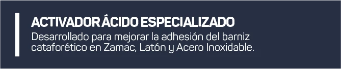 Es un activador químico especial de alto rendimiento, desarrollado para optimizar la adhesión del barniz catafórico a diversos sustratos, incluidos zamac, latón, níquel y acero inoxidable. Con una formulación avanzada, ACTIVE HP MC ofrece una solución eficiente para procesos de electrodeposición, especialmente después del uso de cobre ácido. Este innovador producto proporciona un microataque uniforme, asegurando un acabado impecable sin alterar su apariencia.